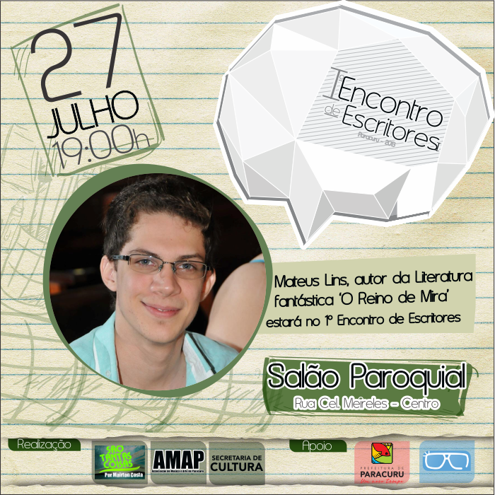 Mateus Lins nasceu no dia 26 de abril de 1995 em Fortaleza – CE. Começou a se dedicar a literatura aos oito anos e aos treze terminou de escrever seu primeiro livro, mas só oficializou sua carreira de escritor, em perspectiva nacional, aos dezessete com seu romance, de ficção maravilhosa, O Reino de Mira. Integrante da Acade7 (academia de letras do Colégio 7 de Setembro) e membro do CNA (Clube dos Novos Autores), ele se dedica ao máximo ao caminho literário, contando com publicações e prêmios literários em variadas antologias. Atualmente é universitário no curso de Direito na Universidade de Fortaleza, criador do blog Curioso Inovador e podcaster do LiterárioCast (Mais Resenhas).